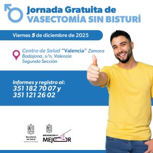 Zamora, Michoacán, 2 de diciembre de 2025.- La Secretaría de Salud de Michoacán (SSM) anuncia la realización de una jornada de vasectomía sin bisturí gratuita en el municipio de Zamora, con el objetivo de promover la planificación familiar y el ejercicio de una paternidad responsable.