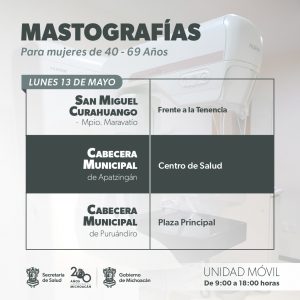 El lunes 13 de mayo, las unidades móviles de mastografía, que cuentan con capacidad para atender hasta 120 usuarias por día, estarán en el centro de salud de Apatzingán y en las plazas principales de Puruándiro y San Miguel Curahuango, tenencia de Maravatío.