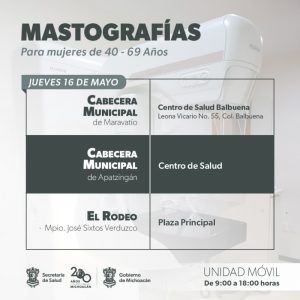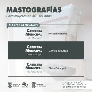 El lunes 13 de mayo, las unidades móviles de mastografía, que cuentan con capacidad para atender hasta 120 usuarias por día, estarán en el centro de salud de Apatzingán y en las plazas principales de Puruándiro y San Miguel Curahuango, tenencia de Maravatío.