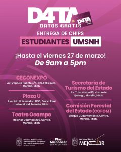 Morelia, Michoacán, 25 de marzo de 2026.- Para acercar los beneficios del Programa D4TA Datos Gratis a todas las regiones del estado, el Instituto de Educación Media Superior y Superior del Estado (Iemsysem) invita a estudiantes de la Universidad Michoacana de San Nicolás de Hidalgo (UMSNH) a conocer y acudir a las sedes habilitadas en el interior del estado para recoger y activar su chip con internet gratuito.