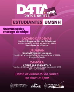 Morelia, Michoacán, 25 de marzo de 2026.- Para acercar los beneficios del Programa D4TA Datos Gratis a todas las regiones del estado, el Instituto de Educación Media Superior y Superior del Estado (Iemsysem) invita a estudiantes de la Universidad Michoacana de San Nicolás de Hidalgo (UMSNH) a conocer y acudir a las sedes habilitadas en el interior del estado para recoger y activar su chip con internet gratuito.