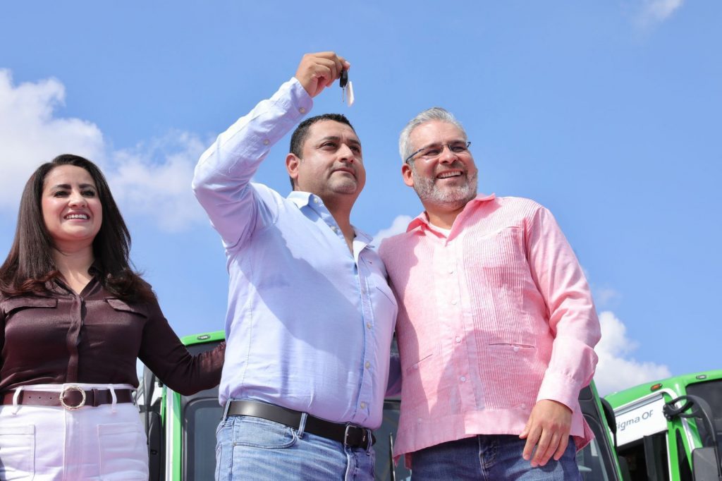 Uruapan, Michoacán, 5 de diciembre de 2025.- El gobernador Alfredo Ramírez Bedolla entregó en Uruapan las primeras 80 unidades nuevas a colectivos del transporte público urbano, con lo que se convierte en el primer municipio de Michoacán en implementar el Sistema Integrado de Transporte como parte del programa de modernización.