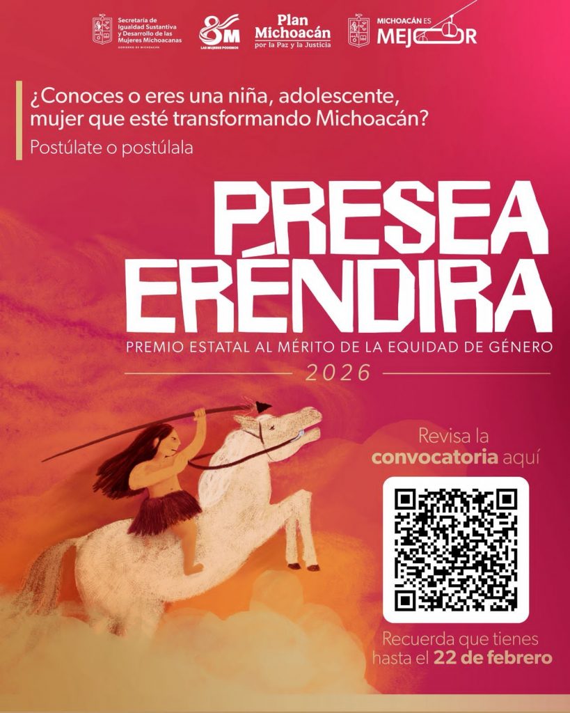 Reconocer a las niñas hoy es impulsar sus sueños y decirles que su voz importa, que su talento cuenta y que Michoacán cree en ellas. La Presea Eréndira es una invitación a mirar a las niñas como protagonistas del presente. Consulten la convocatoria completa y postulen en la página web: https://mujer.michoacan.gob.mx/convocatorias/presea-erendira/, tienen hasta el 22 de febrero para enviar sus documentos.