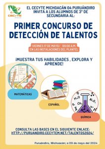 Evento que está dirigido a todos aquellos estudiantes de tercer año de secundaria del municipio de Puruándiro y sus alrededores, ya sea de instituciones públicas o privadas. Los interesados pueden consultar las bases en el enlace http://puruandiro.cecytem.net/talentos2024/.