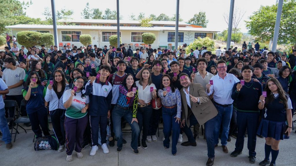 Uruapan, Michoacán, 16 de abril de 2026.- La secretaria de Desarrollo Urbano y Movilidad, Gladyz Butanda Macías, entregó tarjetas prepago de transporte público a estudiantes del Colegio de Estudios Científicos y Tecnológicos de Michoacán (Cecytem) plantel Uruapan, previo a la inauguración de este medio de transporte aéreo.