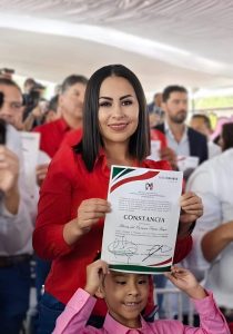 El domingo rindió protesta y recibió la constancia de su partido, el PRI, que la acredita para registrarse como candidata ante las autoridades electorales para la elección consecutiva a diputada por el Distrito Local 13, con cabecera en Zitácuaro, de Michoacán.