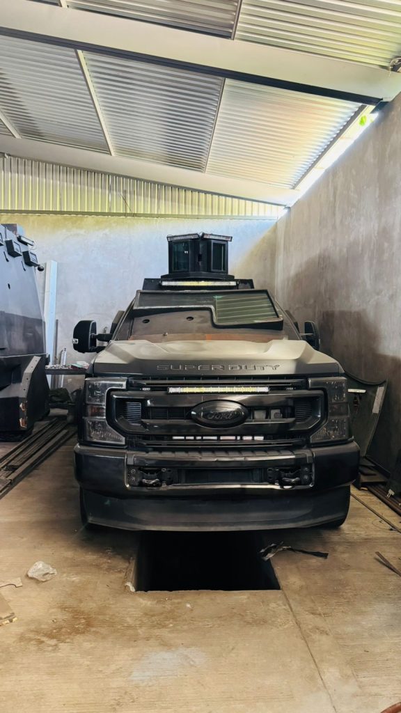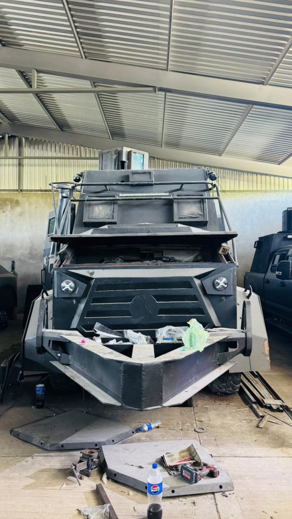Coahuayana, Michoacán, 19 de diciembre del 2025.- La Secretaría de Seguridad Pública (SSP) aseguró en el municipio de Coahuayana una bodega presuntamente utilizada para la fabricación de vehículos con blindaje artesanal, al interior de la misma fueron encontradas ocho unidades, entre estas, dos camiones de los denominados tipo monstruo.