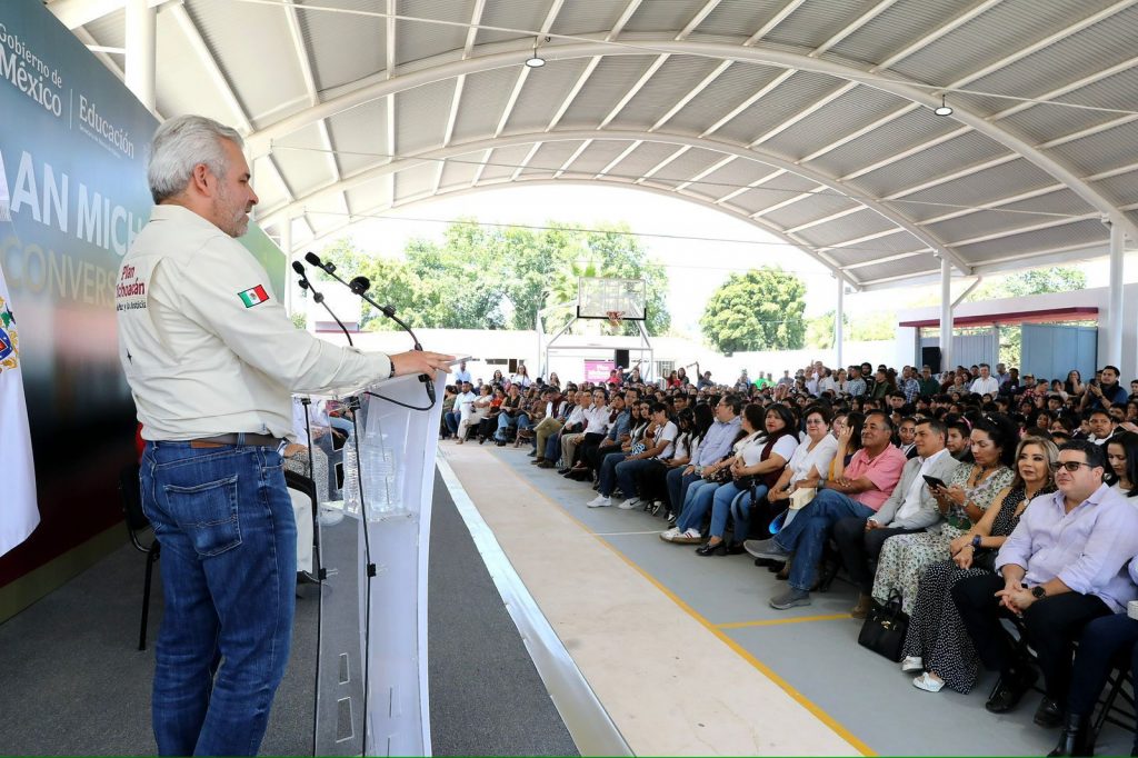 Inauguran Bedolla y Mario Delgado reconversión de telesecundaria a bachillerato, en Uruapan.