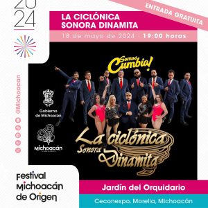 El sábado 18 de mayo, en el marco del aniversario de la fundación de Morelia, el Festival Michoacán de Origen presentará a La Sonora Dinamita y el talento de bandas locales. El espacio en el que se presentarán será el propio jardín del Orquidario, lugar donde se pondrá a bailar a todos los asistentes con temas como “El viejo sombrerón”, “Qué bello”, “A mover la colita”, “Mil horas”, “Mete y saca”, “Se me perdió la cadenita”, entre muchos más. La hora en la que comenzará el ingreso también será a partir de las 17:00 horas.