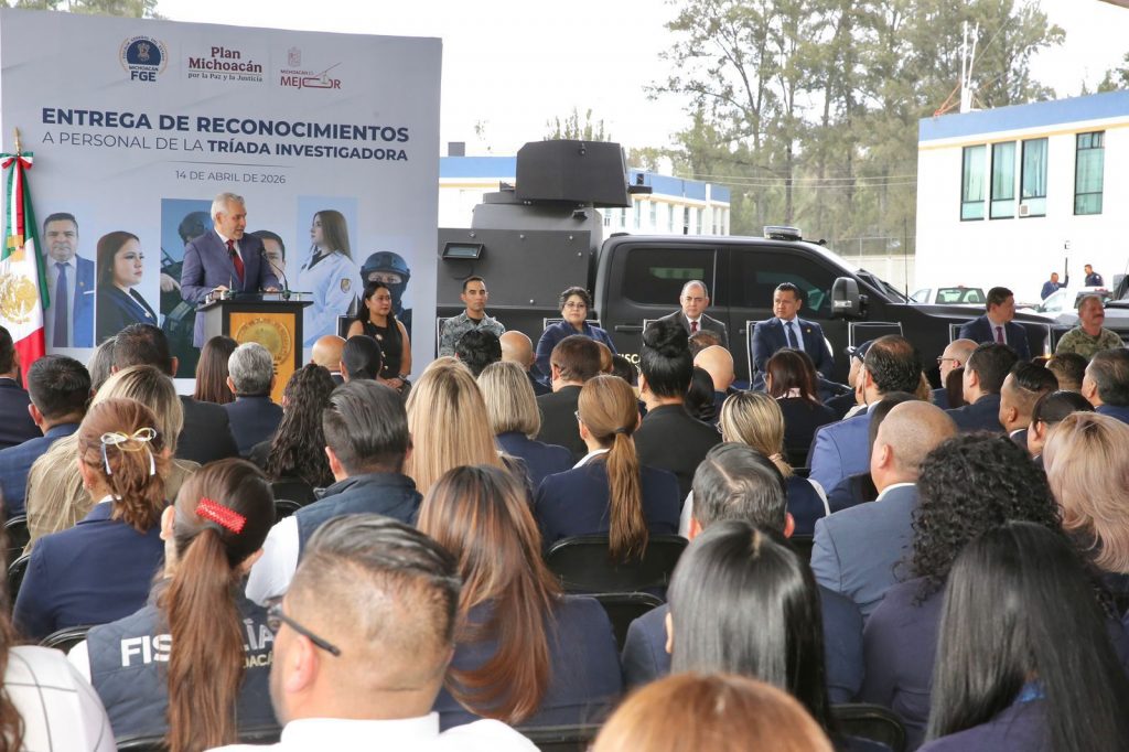 *Morelia, Michoacán, 14 de abril de 2026.-* De acuerdo con el estudio «Radiografía de la Impunidad 2024», presentado por la organización no gubernamental México Evalúa, Michoacán se ha posicionado como el referente nacional en la resolución de delitos y la reducción de la brecha de impunidad en el país, señaló el gobernador Alfredo Ramírez Bedolla al encabezar la entrega de reconocimientos a peritos, policías de investigación y ministerios públicos de la Fiscalía General del Estado.