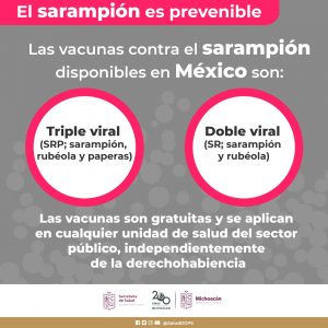 En Michoacán y a nivel nacional sólo existen dos vacunas que protegen contra el sarampión, ambas disponibles en los 364 centros de salud del estado. Se trata de la triple viral que cubre contra el sarampión, rubéola y paperas y que se aplica de los 12 meses de edad y un refuerzo a los 18 meses, y la llamada doble viral, que inmuniza contra el sarampión y rubéola, está indicada desde los 10 y hasta los 39 años de edad y contraindicada para las mujeres embarazadas.