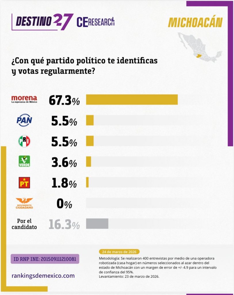 En tanto a la medición por partidos, Morena es claramente la primera fuerza política de Michoacán con el 67.3% de la intención de voto, mientras que los partidos de oposición PAN y PRI empatan con el 5.5% y los siguen el Partido Verde con el 3.6% y el PT con el 1.8%.
