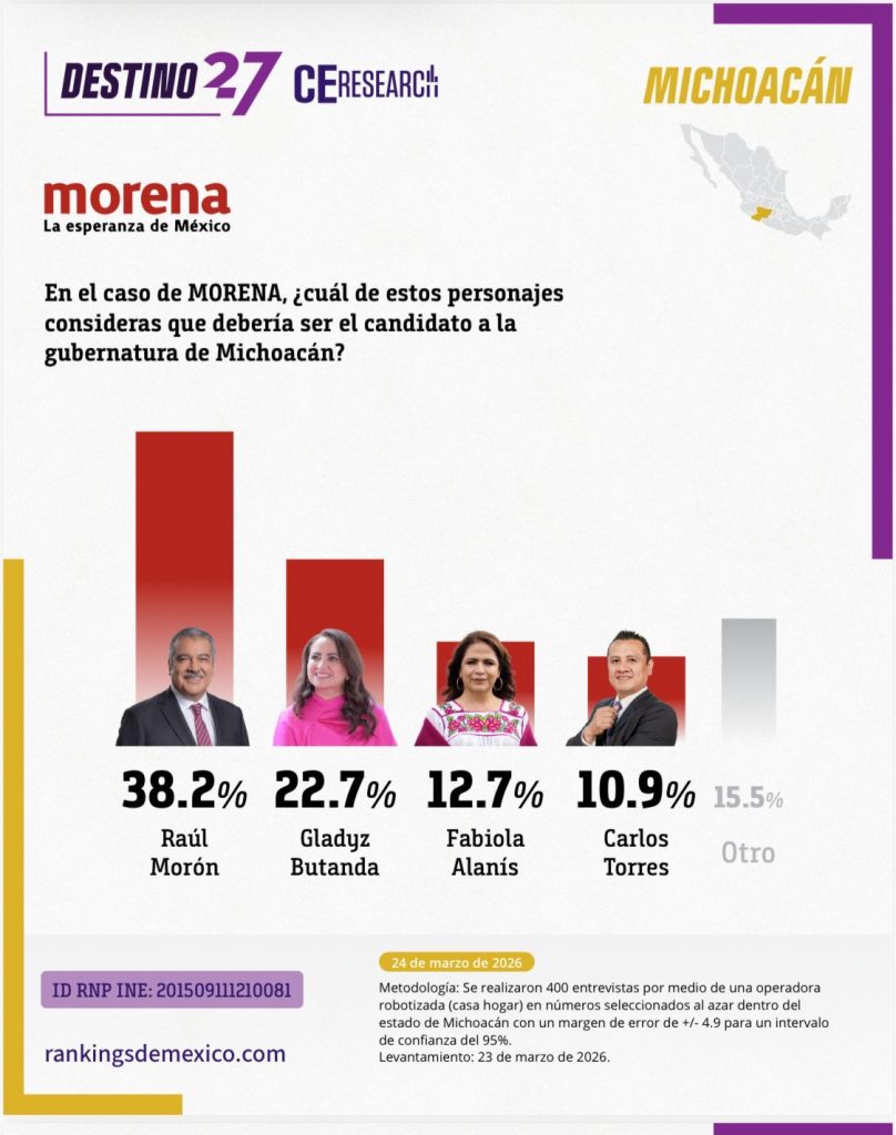 Raúl Morón sería el elegido por el pueblo de Michoacán como el próximo gobernador de la entidad de ser hoy las elecciones, así lo señala CE Research a través de su estudio Destino 27, el cual coloca al actual senador con un 35.6% de las preferencias, lo que representa una ventaja de doble digito sobre sus contendientes.