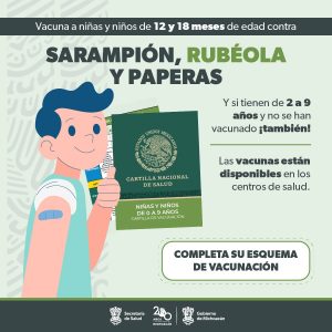 Morelia, Michoacán, 30 de mayo de 2024.- La Secretaría de Salud de Michoacán (SSM) exhorta a madres y padres de familia a llevar a vacunar a sus hijas e hijos a uno de los 364 centros de salud que hay en el estado, pues mañana concluye la Campaña Nacional de Recuperación de Coberturas.