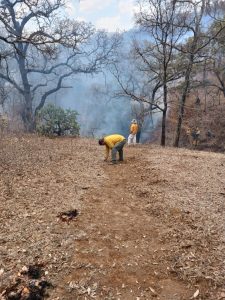 De acuerdo con el Centro Estatal de Manejo del Fuego, brigadistas de la Cofom, Comisión Nacional Forestal (Conafor), Ayuntamientos y voluntarios continúan los trabajos por tierra para la liquidación del fuego, realizando brechas corta fuego así como líneas negras para evitar que el siniestro avance.
