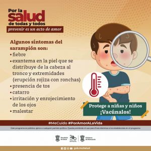 En Michoacán se realiza vigilancia epidemiológica con el propósito de evitar la reintroducción del virus y garantizar el diagnóstico oportuno, pues el contagio ocurre cuando la persona enferma tose o estornuda y las gotitas de saliva que expulsa penetran por las vías respiratorias de quienes aún no han sido vacunados y no han padecido esta enfermedad.