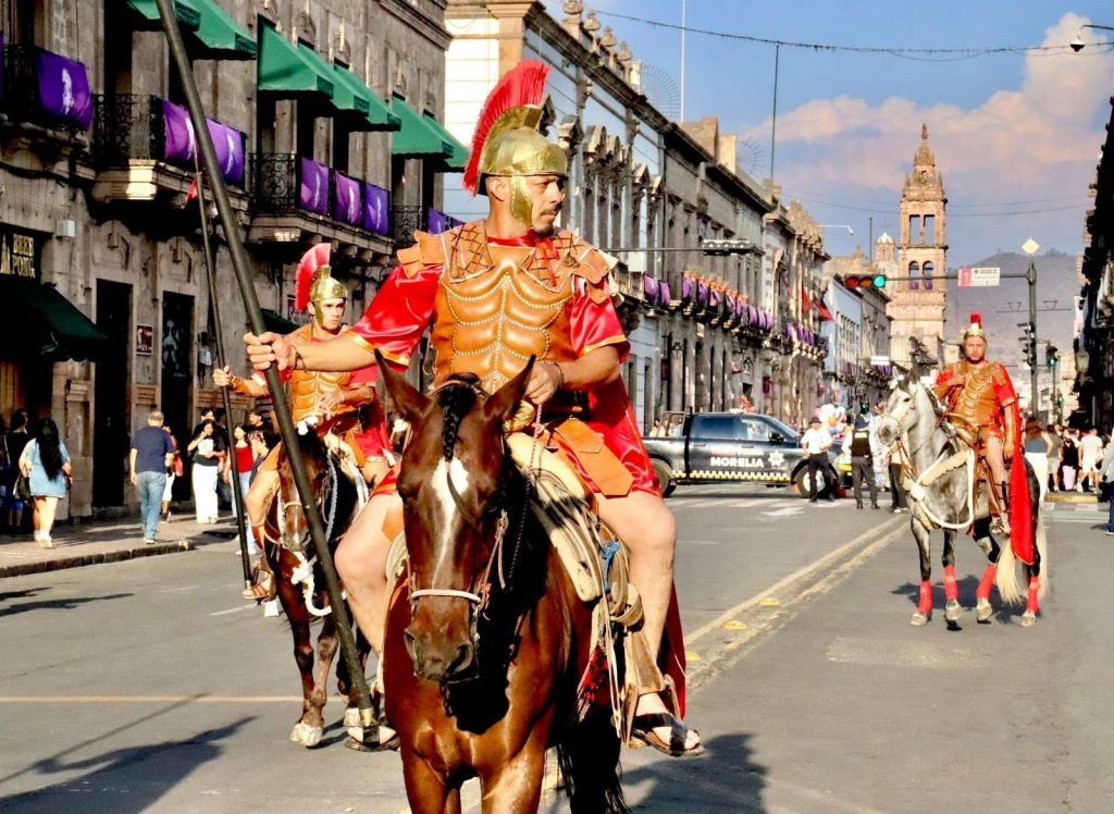Asimismo, la presencia de soldados romanos sobre la Antigua Calle Real sorprendió a turistas y visitantes, evocando el simbolismo y la tradición que caracterizan estas celebraciones, y enriqueciendo la experiencia cultural de quienes eligieron a Morelia como su destino.