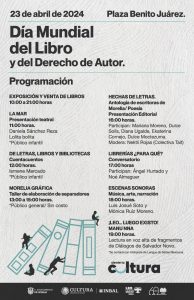 Morelia, Michoacán; 22 de abril de 2024 – Este próximo martes 23 de abril, la Secretaría de Cultura de Morelia invita a todas y todos los morelianos, así como a los visitantes de la ciudad, a celebrar el Día Mundial del Libro y el Derecho de Autor con una variada y especial agenda de actividades.