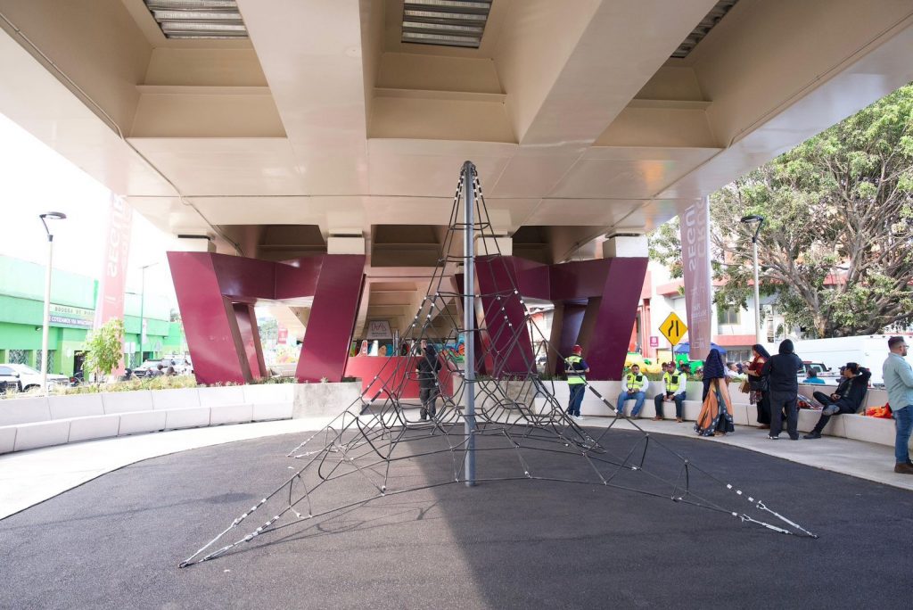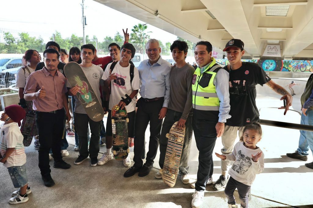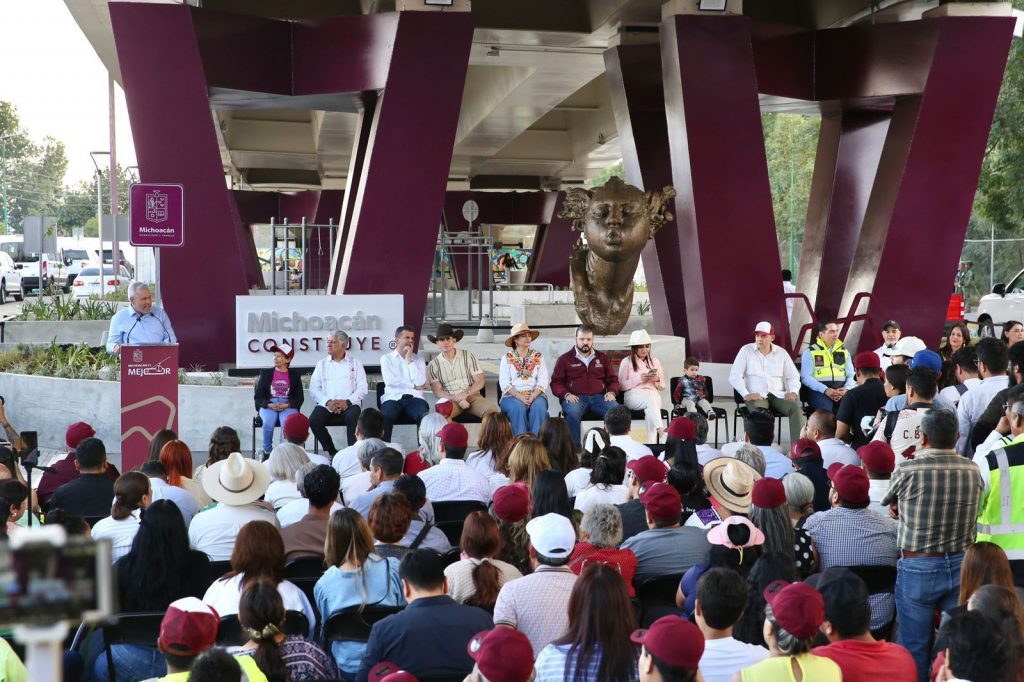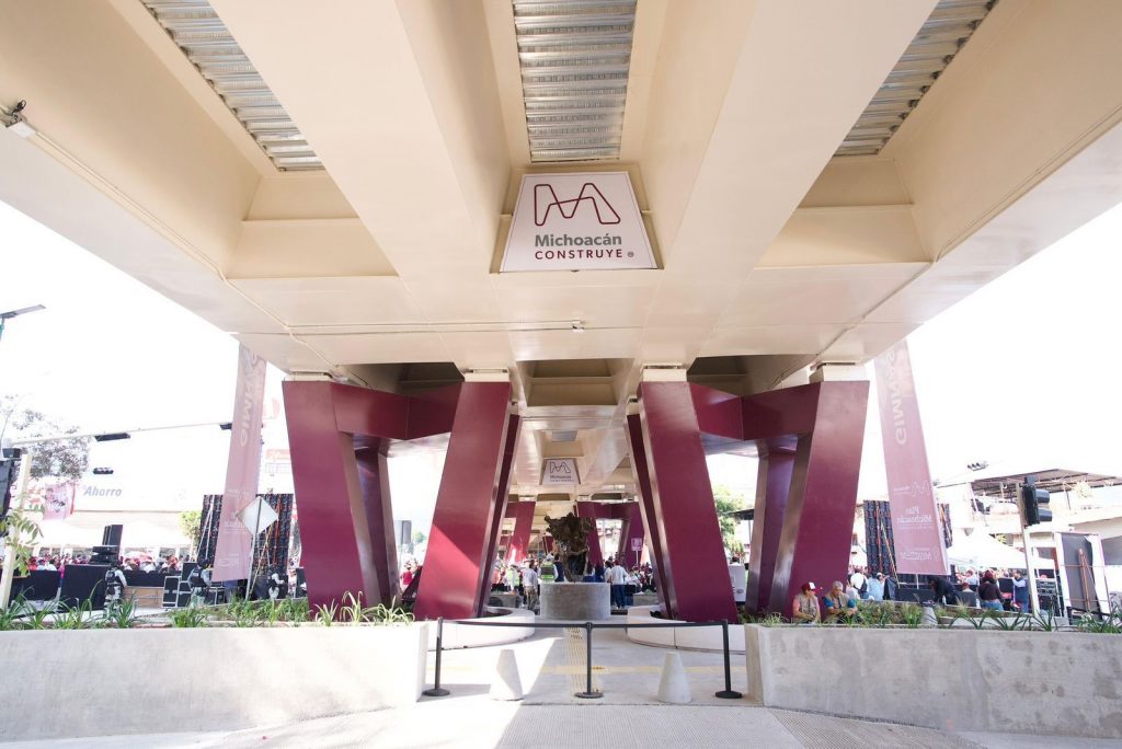 En su bajopuente, el paso vehicular cuenta con 2 mil 627 metros cuadrados de áreas de recreación para el disfrute de las familias uruapenses, con skatepark, gimnasio al aire libre, ciclovía y juegos infantiles, así como cruces seguros, luminarias solares, áreas verdes, banquetas amplias y dos grandes esculturas del artista uruapense Javier Marín.