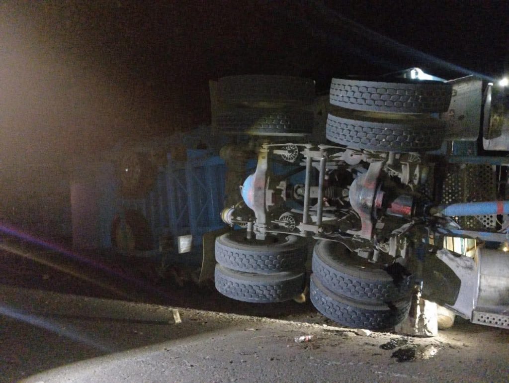 El conductor refirió a las autoridades que, al tomar la curva, dos neumáticos estallaron, ocasionando que perdiera el control y se produjera la volcadura.